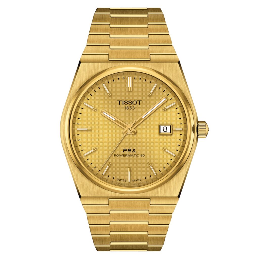 Enhance your timepiece collection with the golden allure of the Tissot PRX Powermatic 80, where traditional aesthetics meet contemporary reliability.