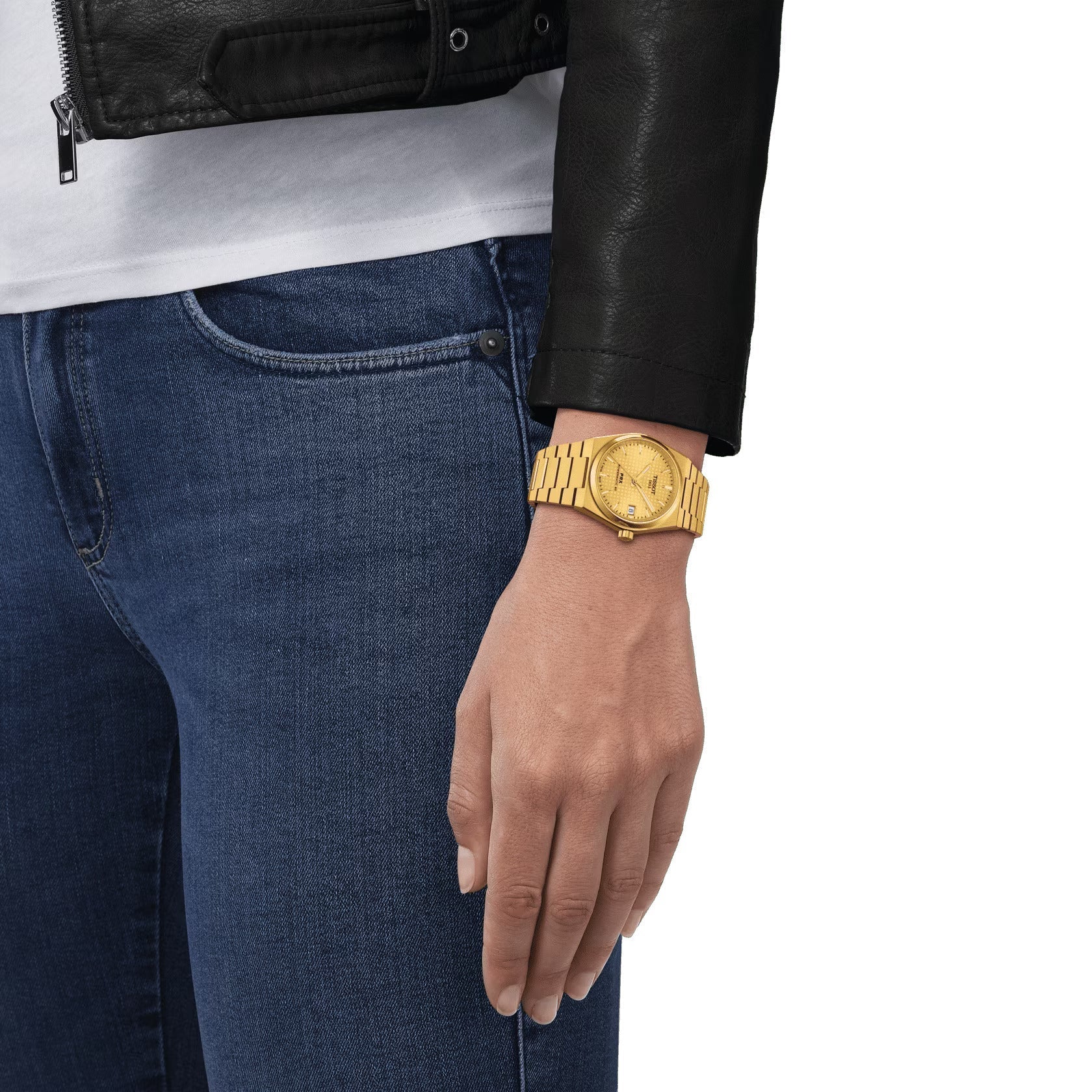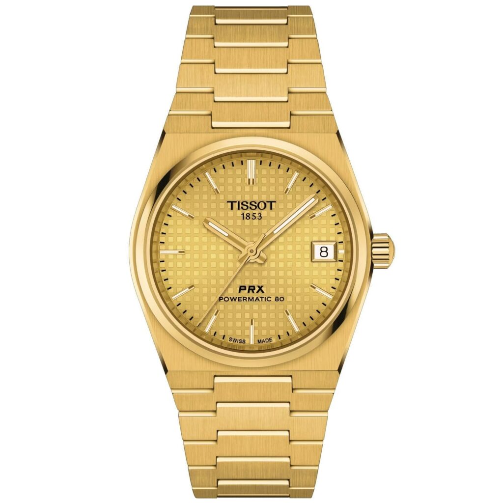 Tissot PRX 35mm Powermatic 80, a harmonious blend of nostalgic glamour and contemporary ingenuity. This 35mm watch features a high-quality gold-PVD case and a striking gold coloured dial. The gold variant, bold and purposeful, brings an undeniable dash of audacity to this automatic model. The waffle dial pattern lends further distinction to this timepiece. With water resistance up to 100 meters and a Nivachronâ„¢ balance hairspring, the PRX is an exquisite piece for those who appreciate the art of watchmaking. The satin-finish steel bracelet with a triple-blade folding steel clasp guarantees unyielding comfort. Be bold with the Tissot PRX 35mm Powermatic 80 in gold PVD.