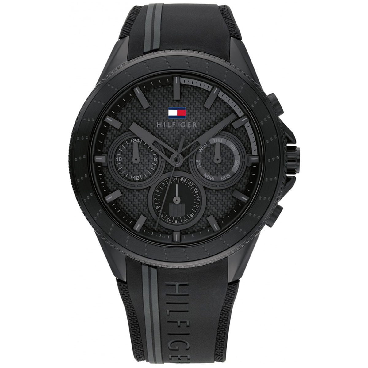The Men’s Tommy Hilfiger Watch 179.1861 (1791861) is available to buy from Shade Station. It features a black silicone strap, an ip black stainless steel case and has a black with three hand movement, sub dial day/date display dial.Â