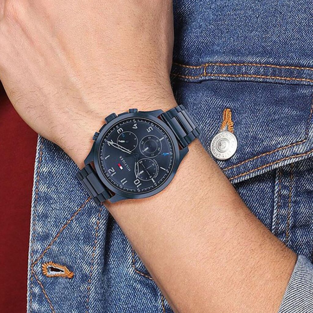 A casual but edgy take on the Iconic Tommy Style. The 44MM case is available in various finishes including stainless steel, Blue IP, Grey IP, and Black IP. The multifunction dial features dome sub-eyes with a circular brushed texture. Attached to a bracelet, mesh, or leather straps. 5 ATM/ 50 Meters.