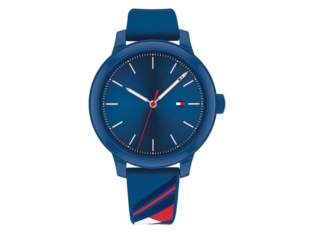 Tommy Hilfiger women’s watch. Time after time, our sport watch delivers. This version offers sweeping 3-hand movement, and a durable silicone strap with a bold rendering of our iconic flag. 38mm white case, blue-white dial, blue silicone strap.