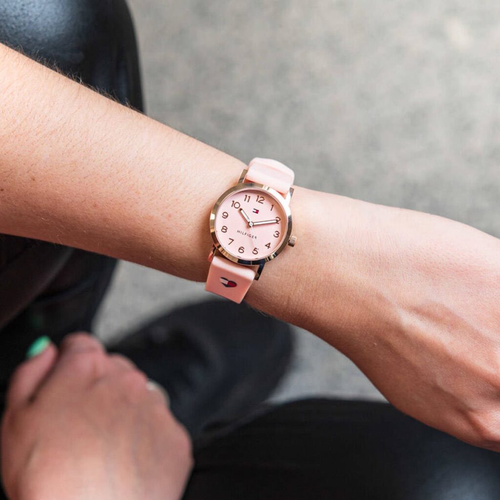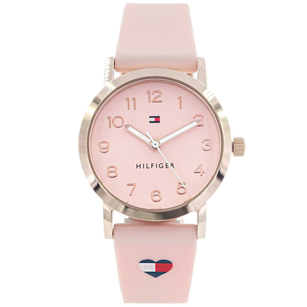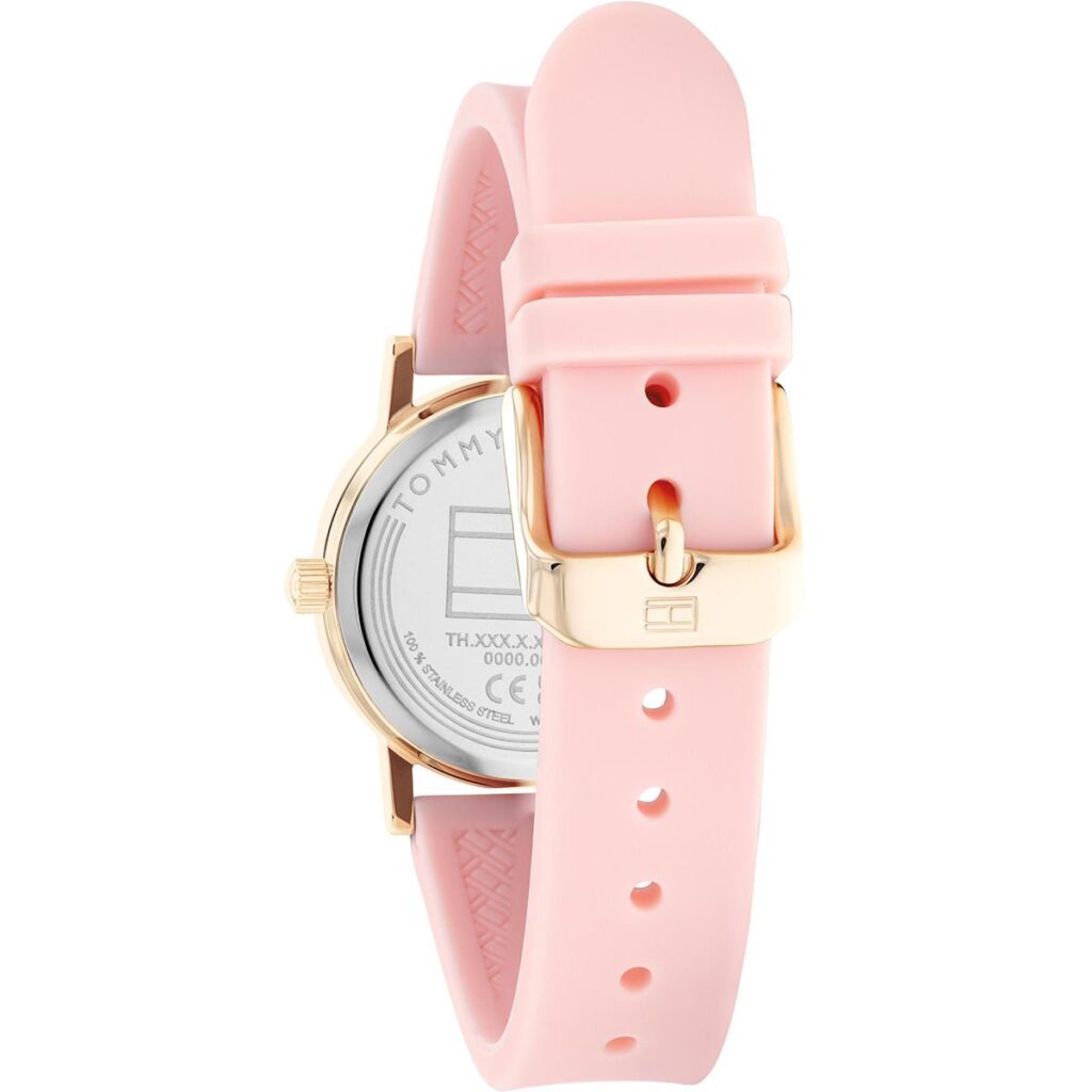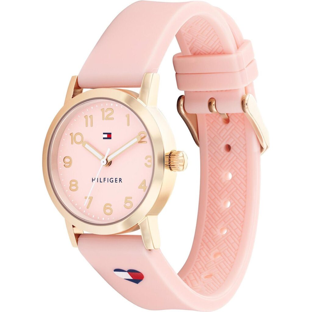 Tommy Hilfiger girls’ watch from the Girls Communion collection made of stainless steel and silicone. We stand in front of an elegant and attractive watch, consisting of pink case with 32 mm diameter with pink dial with pink indexes and hands in pink protected by analogue quartz movement by mineral glass. The bracelet is made of rubber in pink with a heart that has the colours of the Tommy Hilfiger brand. The clasp is made of pin buckle. Water resistant to 3 ATM.