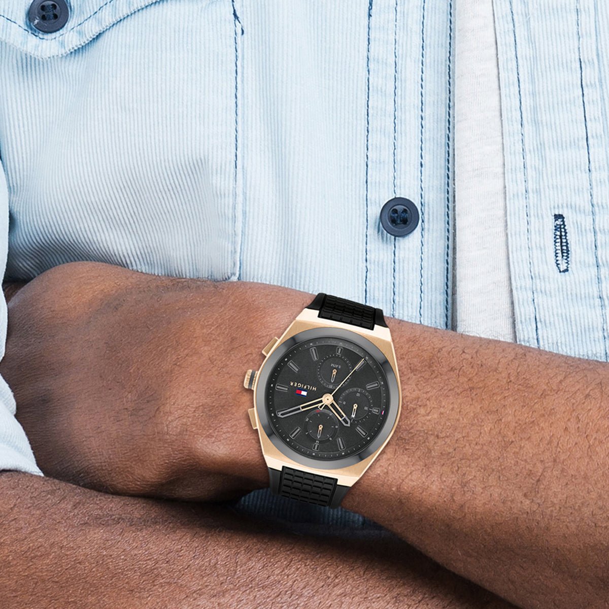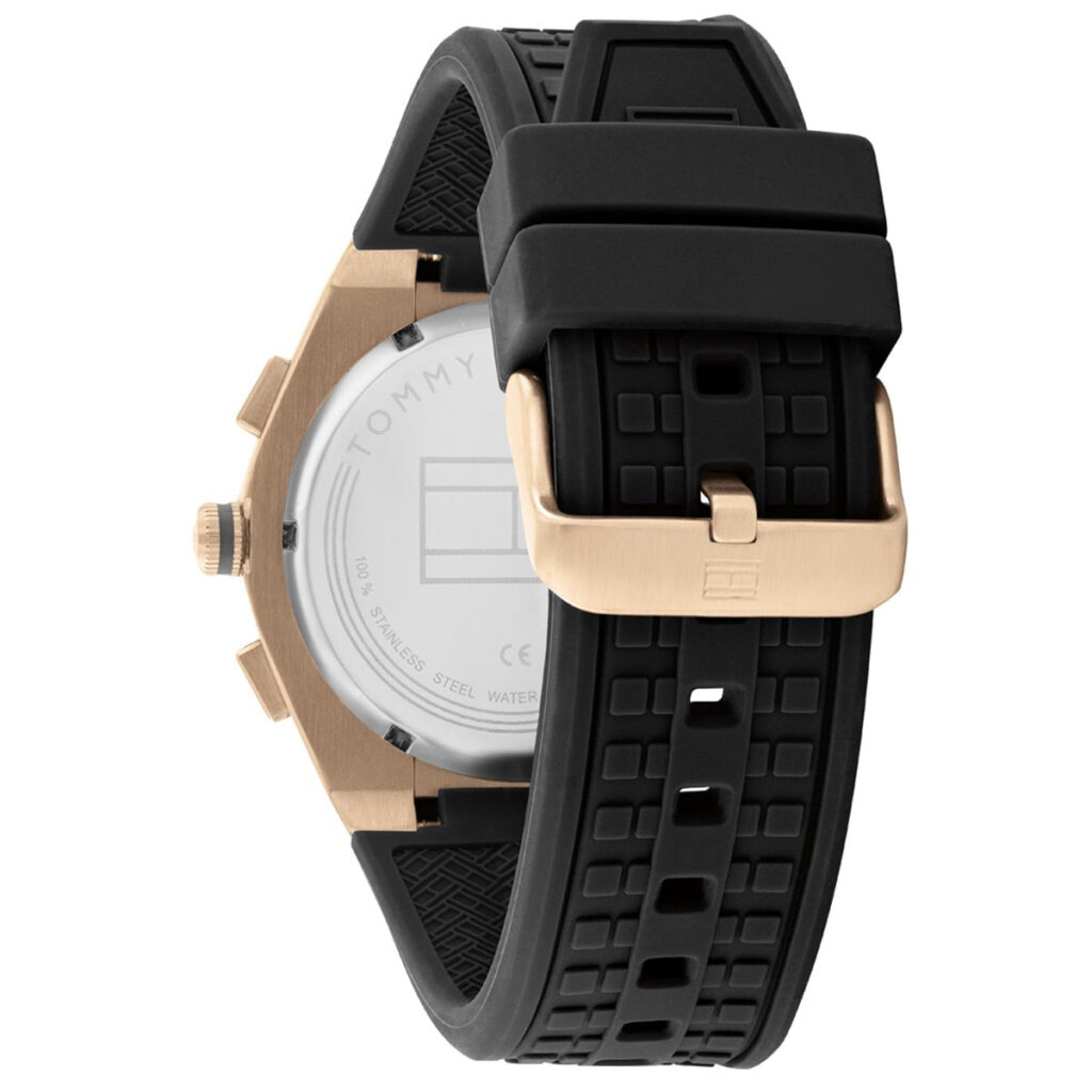 This Tommy Hilfiger watch has a stainless steel case 44mm in diameter and is fitted with a rubber strap. Inside the case lies a movement and the watch features a mineral crystal.