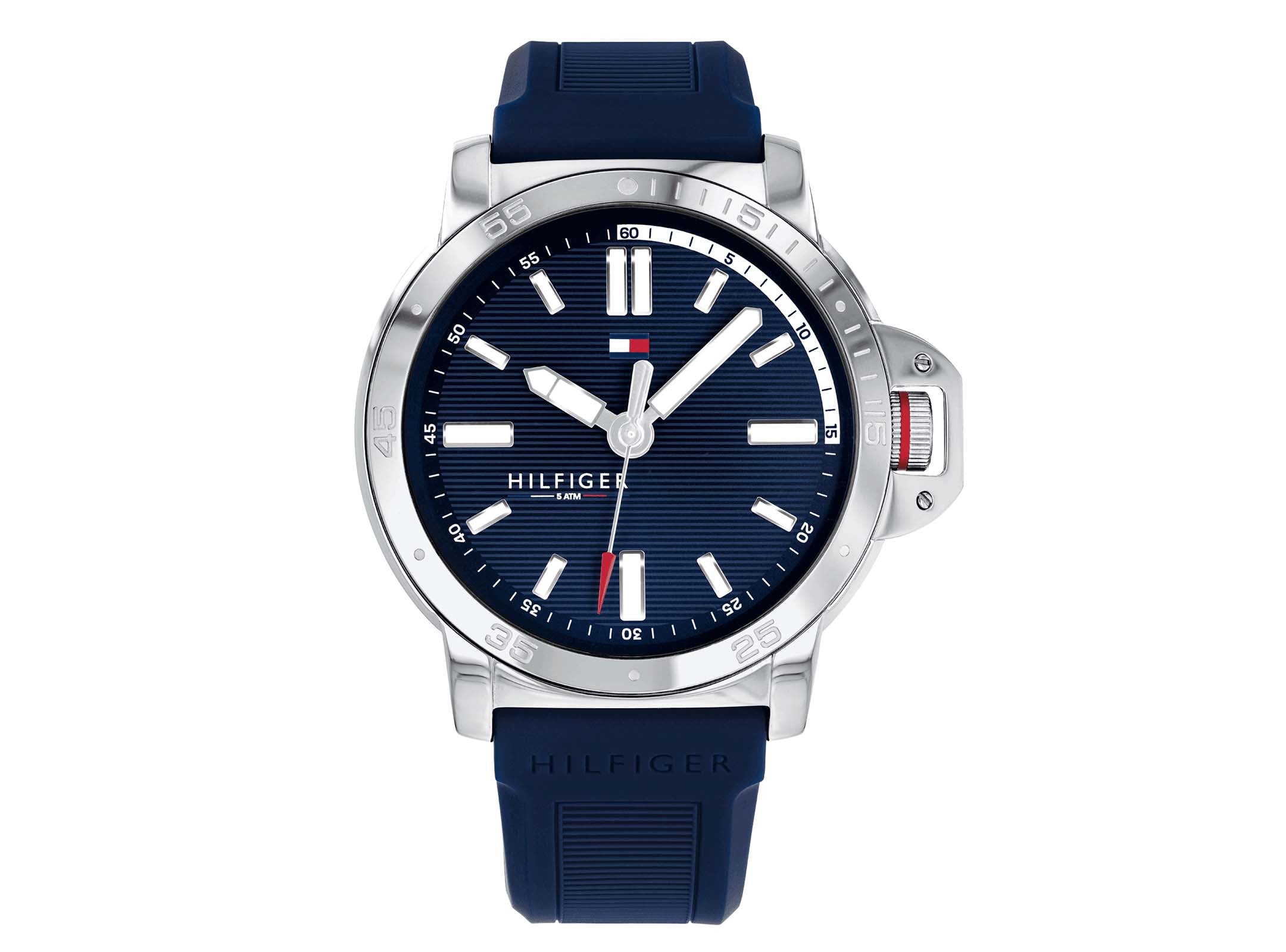 44mm stainless steel case with covered crown protector, navy silicon strap, three-hand movement, water-resistant up to 50 meters.