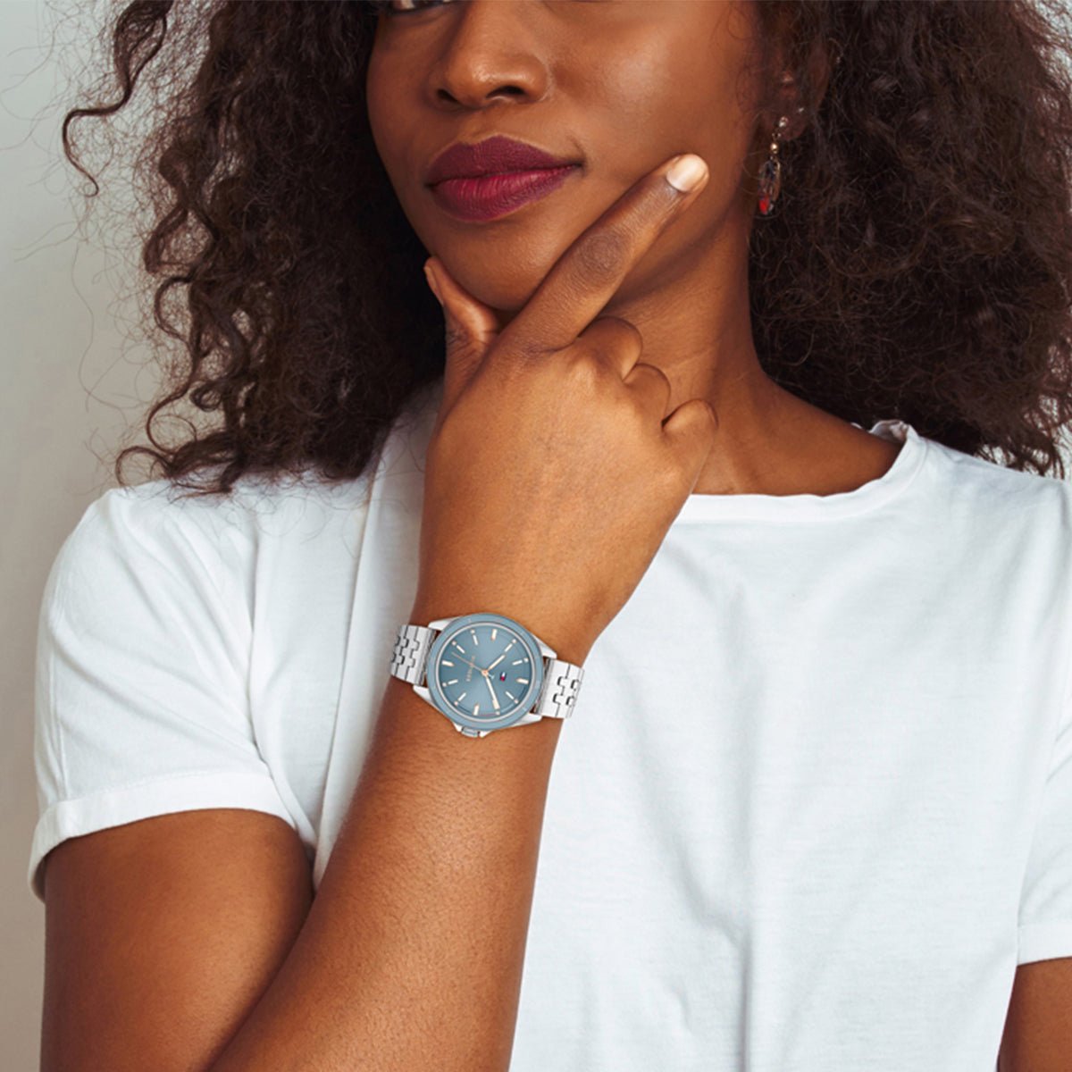 Sporty yet elegant, this fun weekender watch will become a fast favorite thanks to the color contrasted case and bezel and comfortable link bracelet or silicone strap. Shimer finish and gloss stripe sunray dials with stone indexes add unexpected glamour. 38MM case. 5ATM. 3H Movement