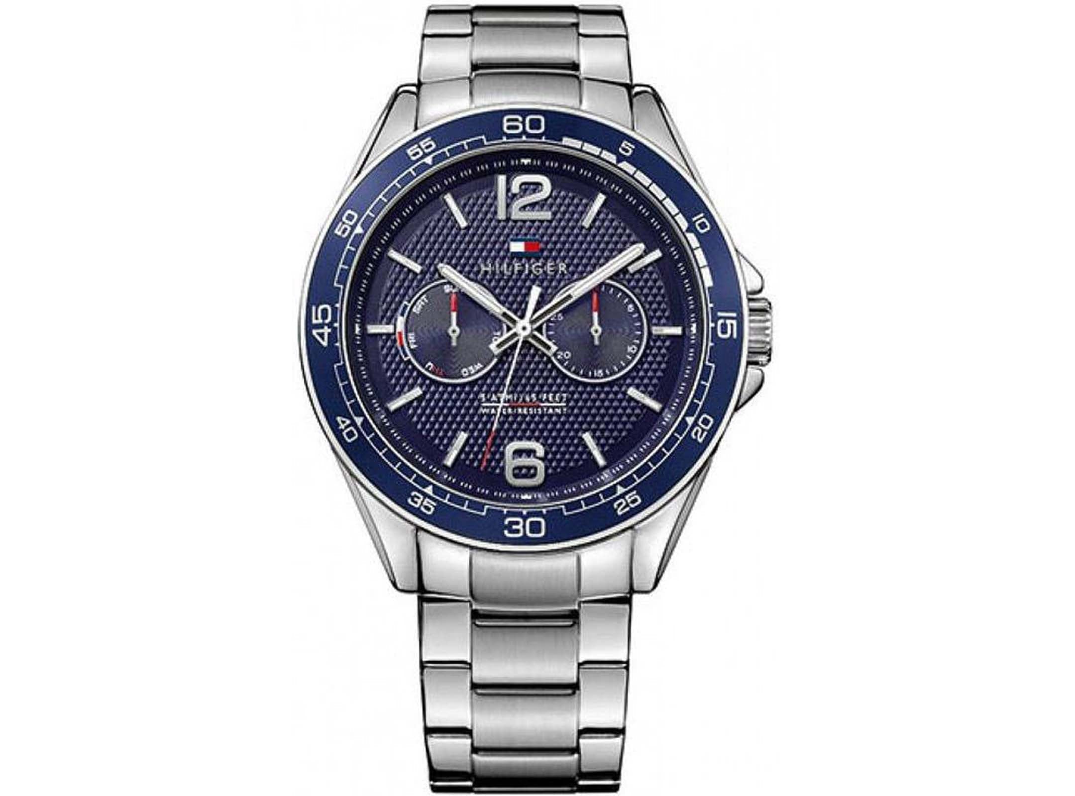 Modern casual meets sophisticated sport in this new multi-eye bracelet watch for men. Crafted of solid stainless steel, it features a 46mm case with sleek black ion-plated aluminum sport bezel, and a blue enamel dial with day and date subdials, Arabic numerals/stick markers and fine line minute reflector. HILFIGER name/flag logo positioned at 12:00. Water resistant to 5 ATM/50 meters.