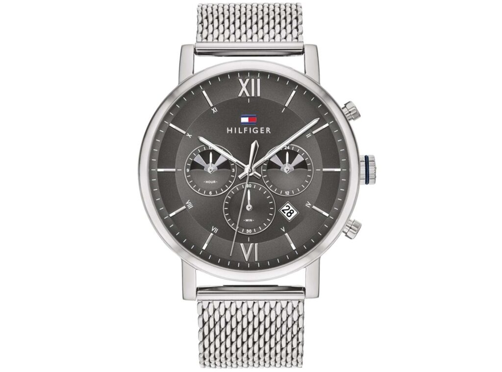 Tommy Hilfiger men’s watch. Impeccable timing. Our dress watch stands out with an elegant stainless steel case and mesh bracelet. Old meets new with Roman numerals and a trio of sub-dials. 44mm stainless steel case and mesh bracelet, multi-function movement, sub-dials.