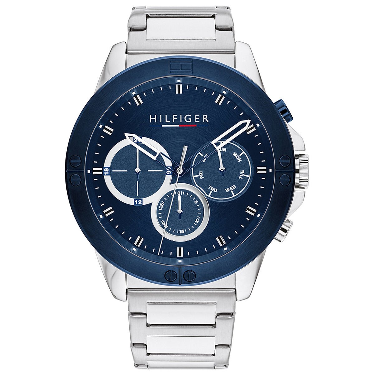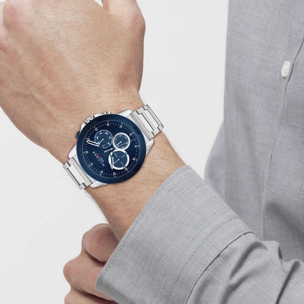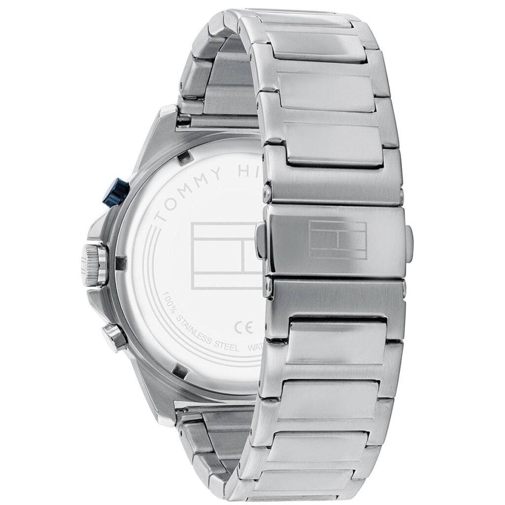 This Tommy Hilfiger watch has a stainless steel case 46mm in diameter and is fitted with a metal strap. Inside the case lies a movement and the watch features a mineral crystal.