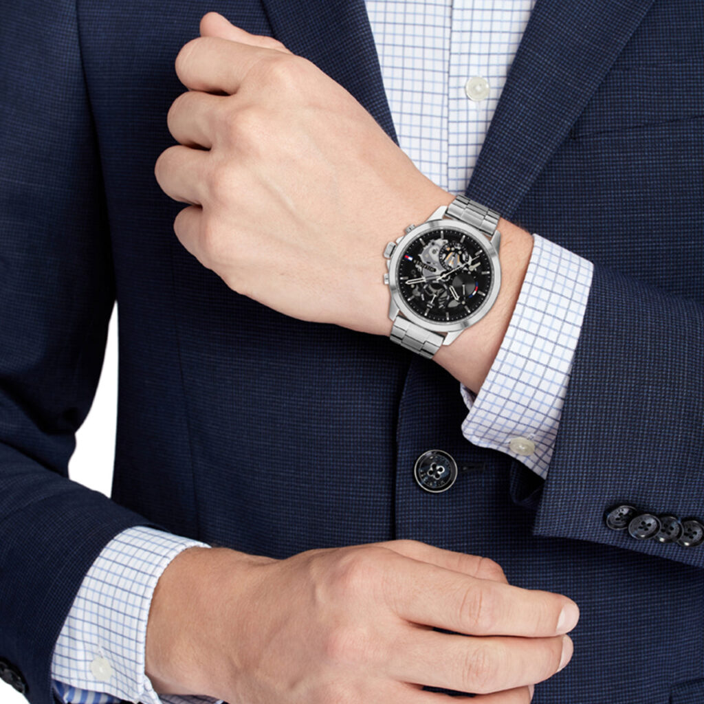 This Tommy Hilfiger watch has a stainless steel case 44mm in diameter and is fitted with a metal strap. Inside the case lies a movement and the watch features a mineral crystal.