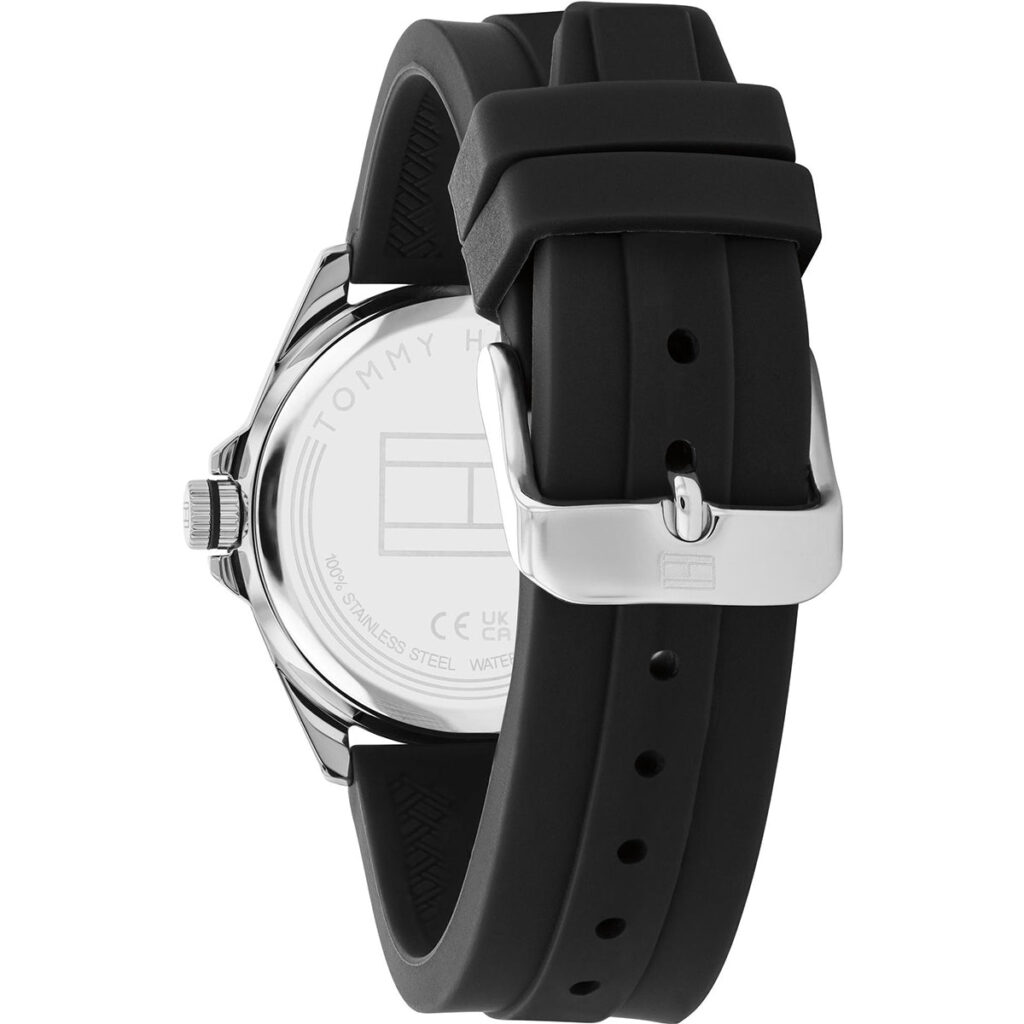 The Tommy Hilfiger Boys 172.0020 is a stylish children’s watch with a 34 mm wide stainless steel case in silver color. This model features a black silicone bracelet. The black dial of the Tommy Hilfiger 172.0020 is protected by a mineral glass. The watch is water resistant to 50m/5atm, which means it has limited water resistance (swimming is not recommended).