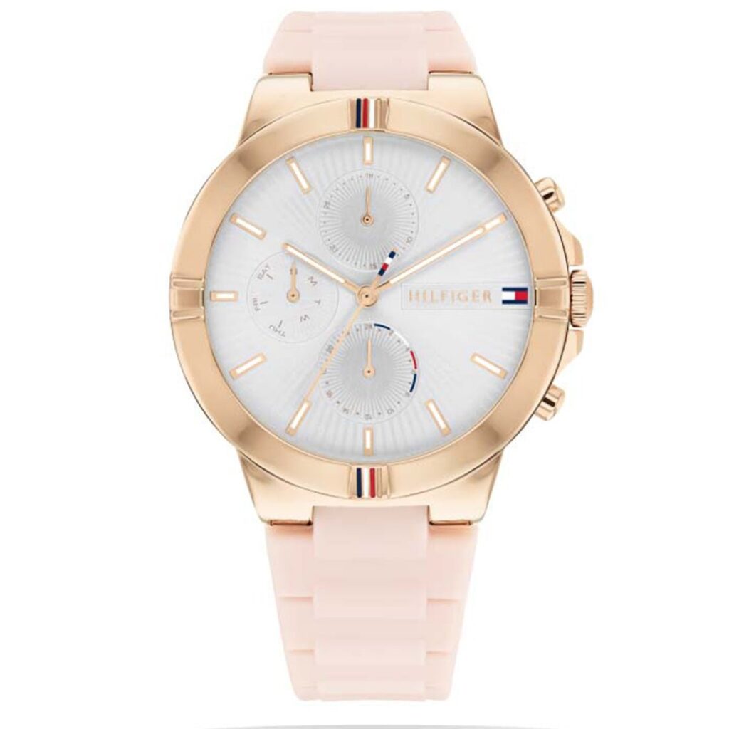 Sporty with an attitude. This collection features a 38MM case available in stainless steel, carnation gold, and gold plated finishes. Stones in the bezel provide an elegant twist on this sporty style. A fan textured dial with iconic elements is paired with integrated and brushed bracelets and silicone straps. 5 ATM/ 50 Meters.