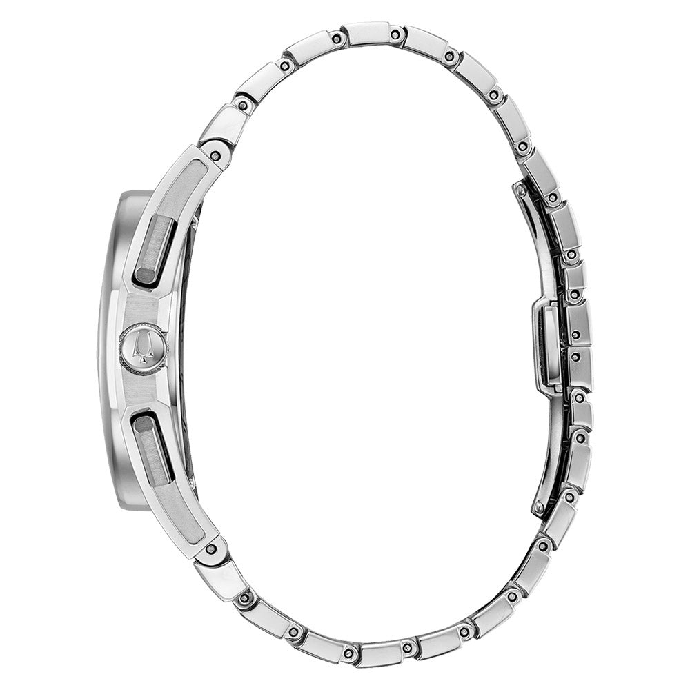 From the Bulova CURV Collection, the world’s first curved chronograph movement offers high-performance quartz technology with an impressive 262 kHz vibrational frequency for precise accuracy. This sophisticated five-hand chronograph features a stainless steel case, a dark blue dial with silver hands and markers, and an exhibition case back. The watch is protected by anti-reflective curved sapphire glass and boasts a screw-back case. The stainless steel bracelet with double-press deployment closure ensures a secure fit, and the timepiece is water-resistant to 30 metres.