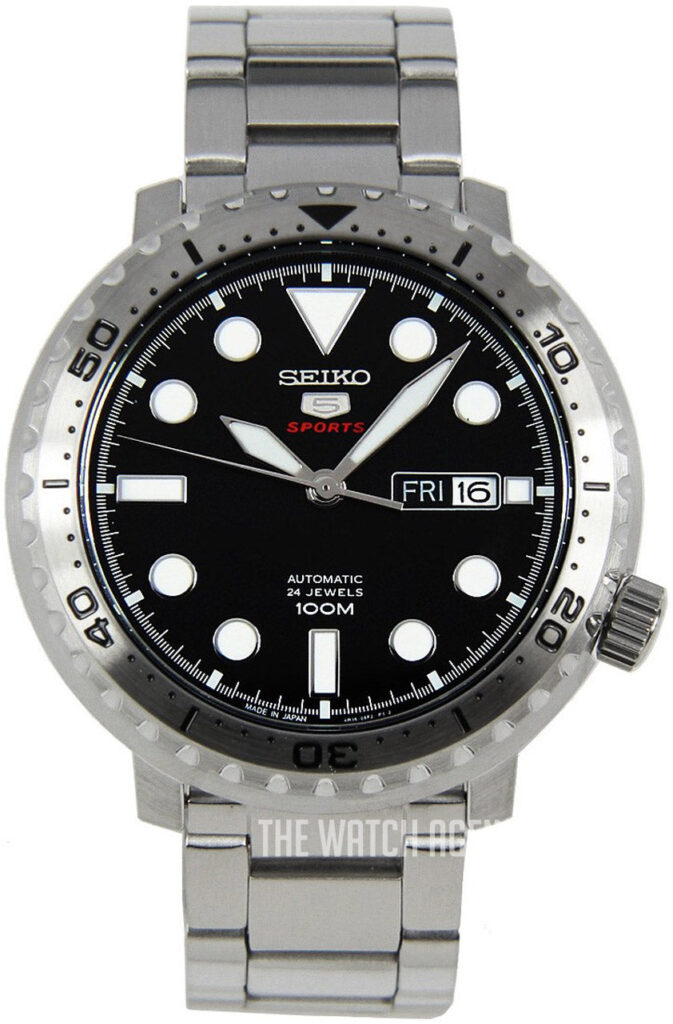 Its black dial is contrasted by large, highly legible luminous hands and markers, ensuring visibility even in low light. The day-date window at 3 o’clock adds practicality, while the rotating bezel emphasizes its diver-inspired design. Powered by Seiko’s automatic 4R36 movement with 24 jewels, it offers both reliability and durability, backed by 100m water resistance.