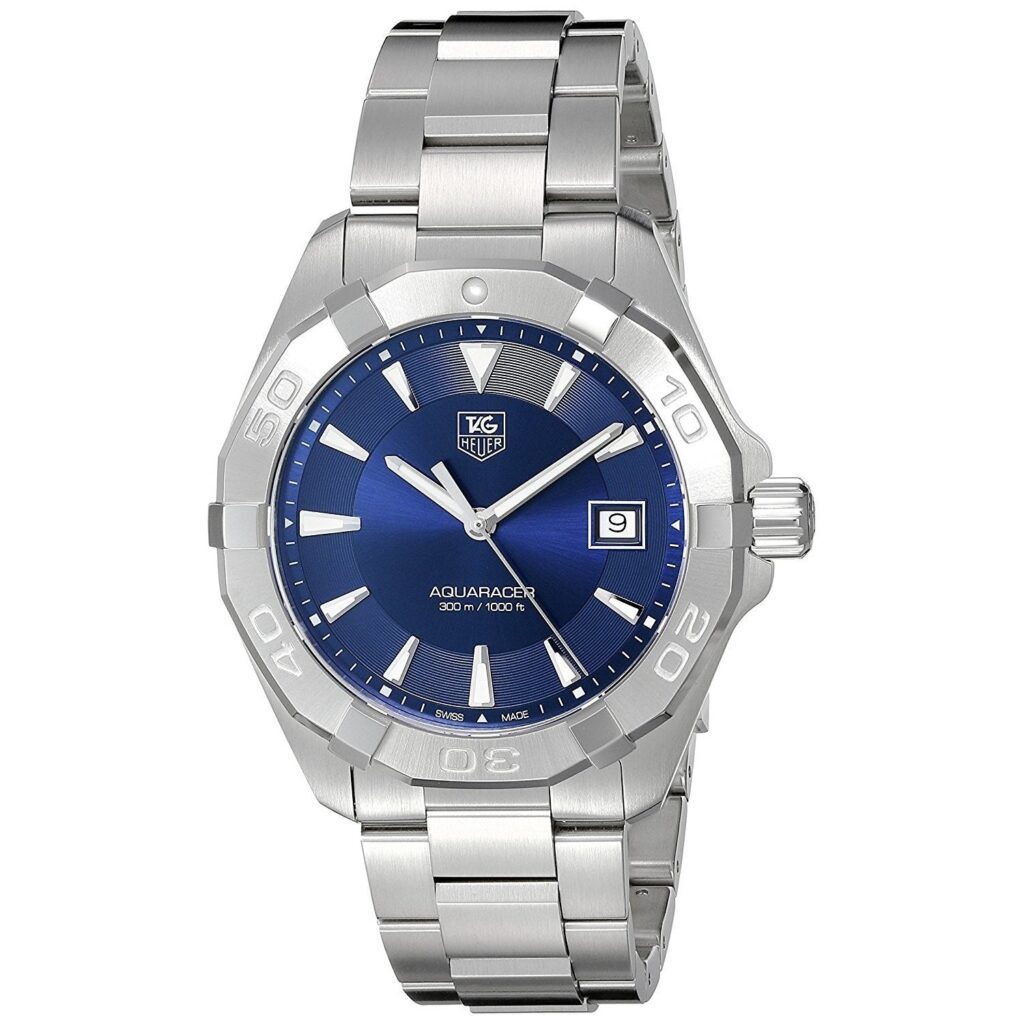 stainless steel case, with a blue dial. Silver stainless steel Bracelet. quartz movement. sapphire crystal. 40mmx 40mmx 12mm case. 20mm band width. 300 meters water resistant. Tag Heuer Aquaracer Quartz Stainless Steel Watch WAY1112.BA0928