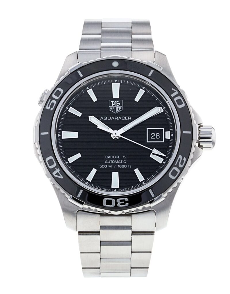 Screw down crown. Solid case back. Case diameter: 41 mm. Case thickness: 10 mm. Round case shape. Band width: 17 mm. Deployment clasp with a push button release. Water resistant at 500 meters / 1650 feet. Functions: date, hour, minute, second. Sport watch style. Watch label: Swiss Made. Tag Heuer Aquaracer 500 Automatic Mens Watch WAK2110.BA0830.