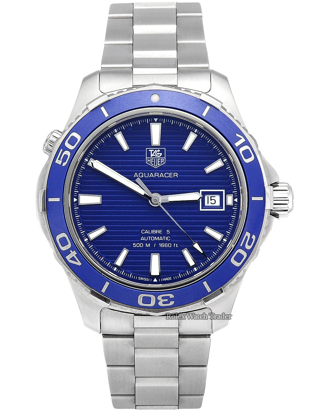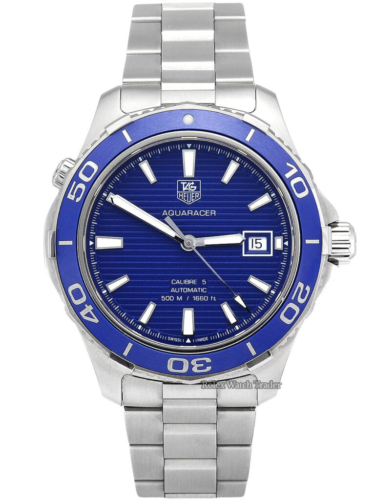 Screw down crown. Solid case back. Case diameter: 41 mm. Case thickness: 13 mm. Round case shape. Band width: 20 mm. Deployment clasp. Water resistant at 500 meters / 1650 feet. Functions: date, hour, minute, second. Luxury watch style. Watch label: Swiss Made. Tag Heuer Aquaracer Calibre 5 Blue Dial Stainless Steel Automatic Men’s Watch WAK2111.BA0830.