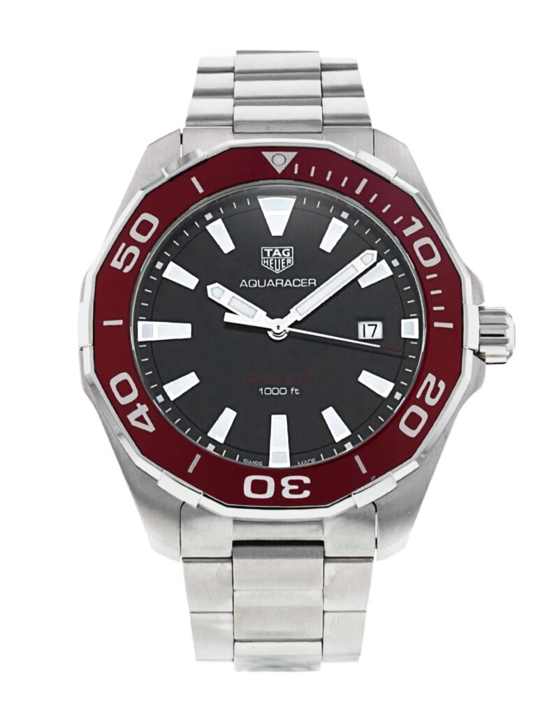 Swiss-made, this bold TAG Heuer Aquaracer is an aesthetic 43 mm watch. This model features a Steel case and a Quartz movement.