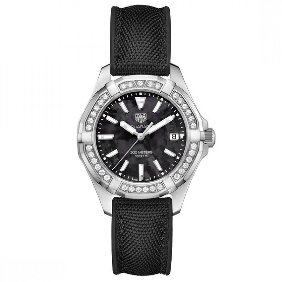 Luxury watches TAG Heuer Aquaracer Diamonds, Quartz, 35 mm. The watch has functions luminescence and date . Basic parameters of the watch are: dial colour is pearl and black, movement type is Quartz watches, water resistent is 300 m and strap material is rubber and textiles.