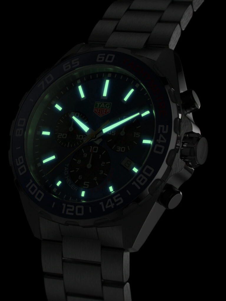 Brushed steel with a tachymeter scale for timing and measuring speed.
