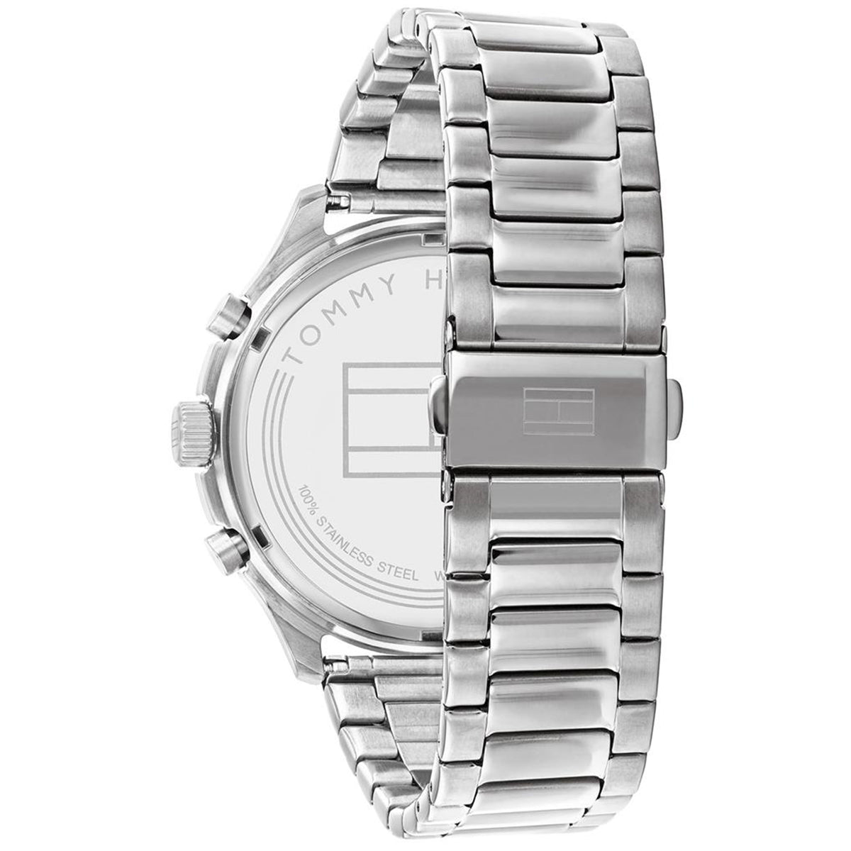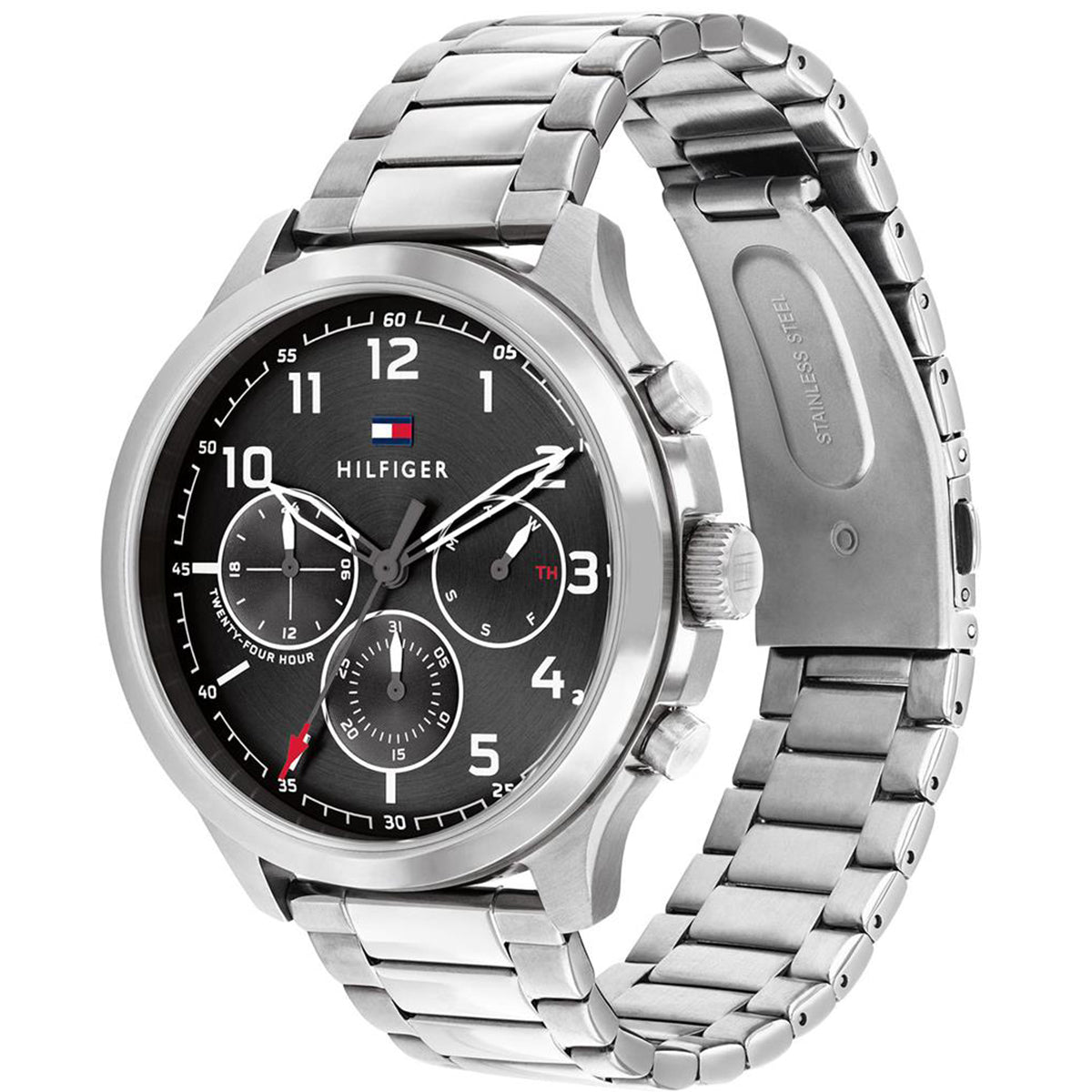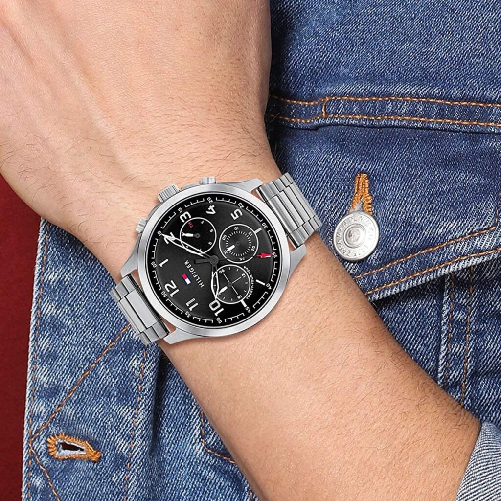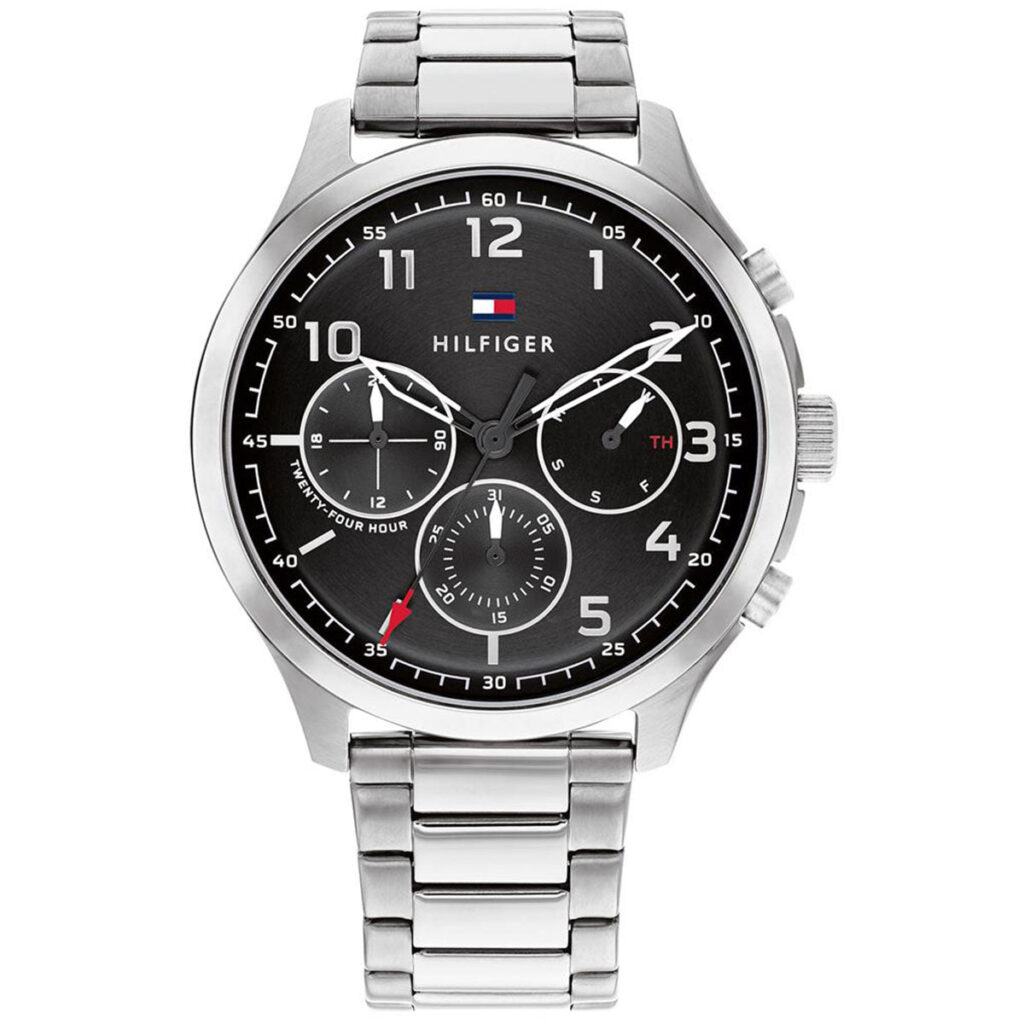 Tommy Hilfiger men’s watch. Make every moment count in our bold watch featuring a stainless steel case and bracelet. Thanks to the precision multifunction movement and a trio of sub-dials, you’ll never be tardy again.