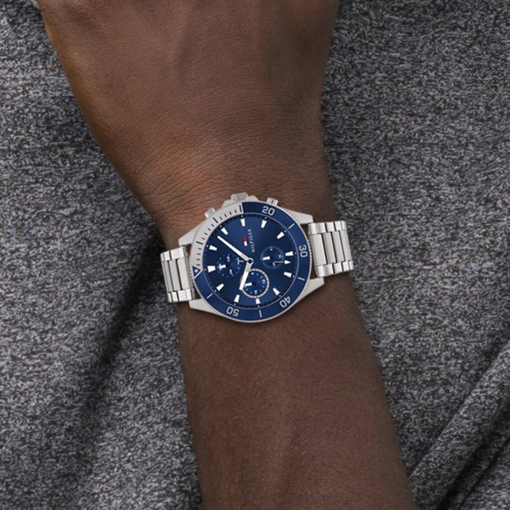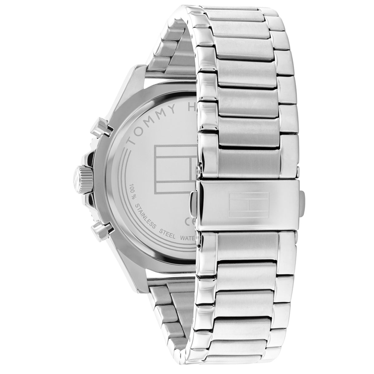 This Tommy Hilfiger watch has a stainless steel case 46mm in diameter and is fitted with a metal strap. Inside the case lies a movement and the watch features a mineral crystal.